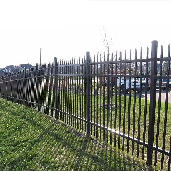 Ogrodzenie stalowe rurowe, z wykorzystaniem pionowych stalowych płytek, kwadratowych piketów i poziomych szyn do tworzenia ogrodzenia, powierzchnia jest ocynkowana i powlekana proszkiem, w stylu Flat Top,Pikiety mogą uniknąć pęknięć, jeśli jest infiltracja wody w -35 stopni.Tego rodzaju ogrodzenia są szeroko stosowane w willi, basenach, ogrodach, rośliniach, trawnikach, instytucjach przemysłowych i finansowych, stadionach sportowych, placach.
